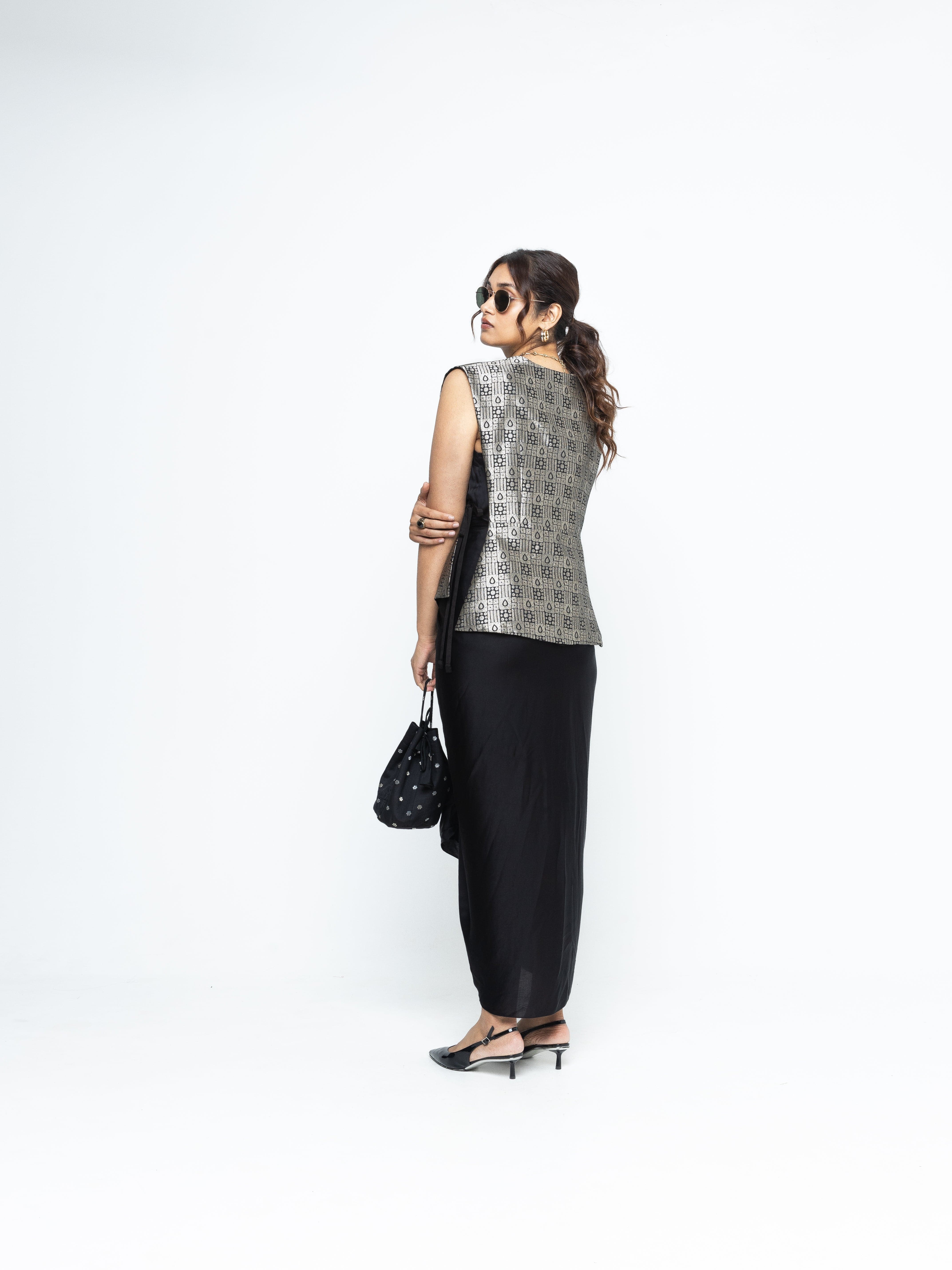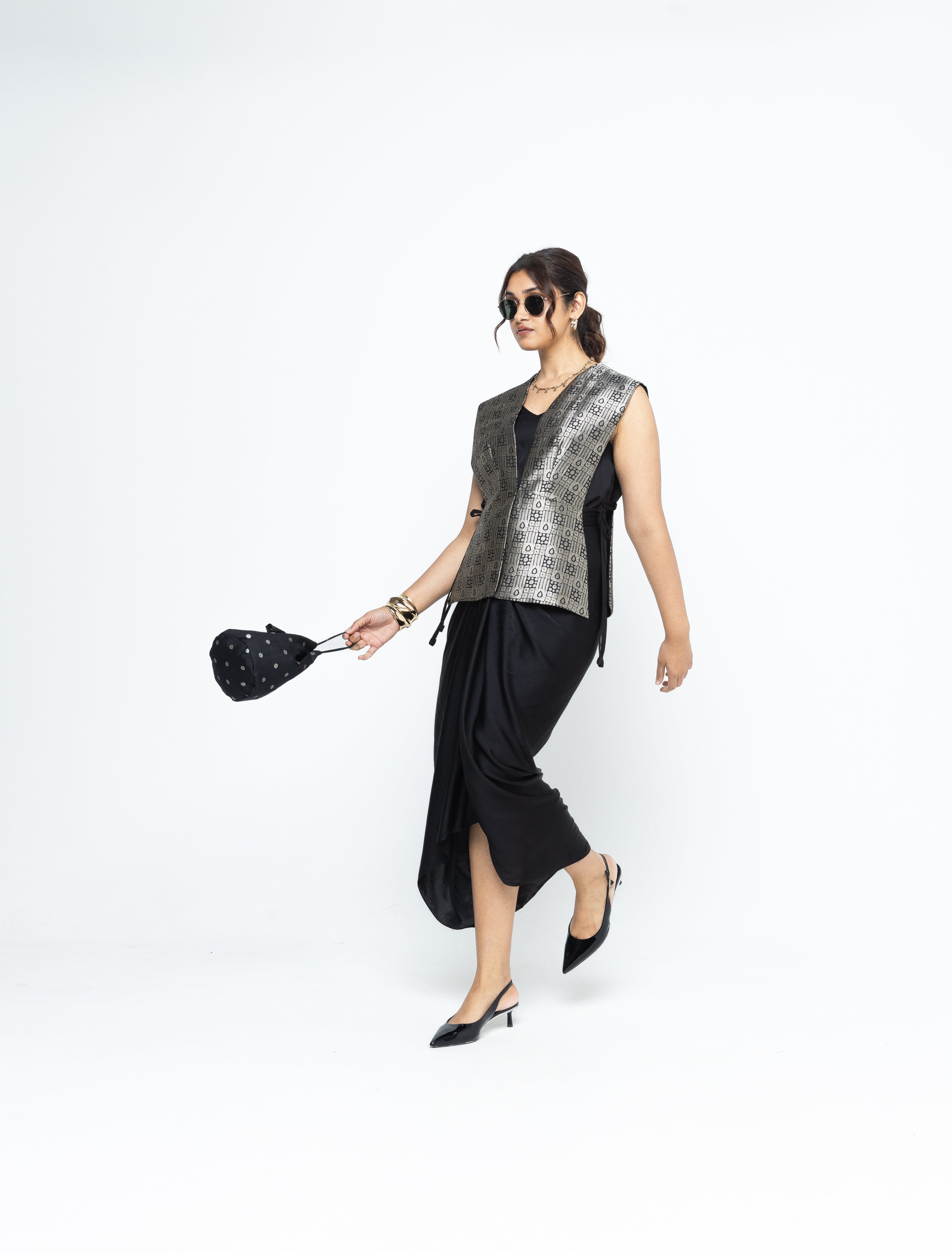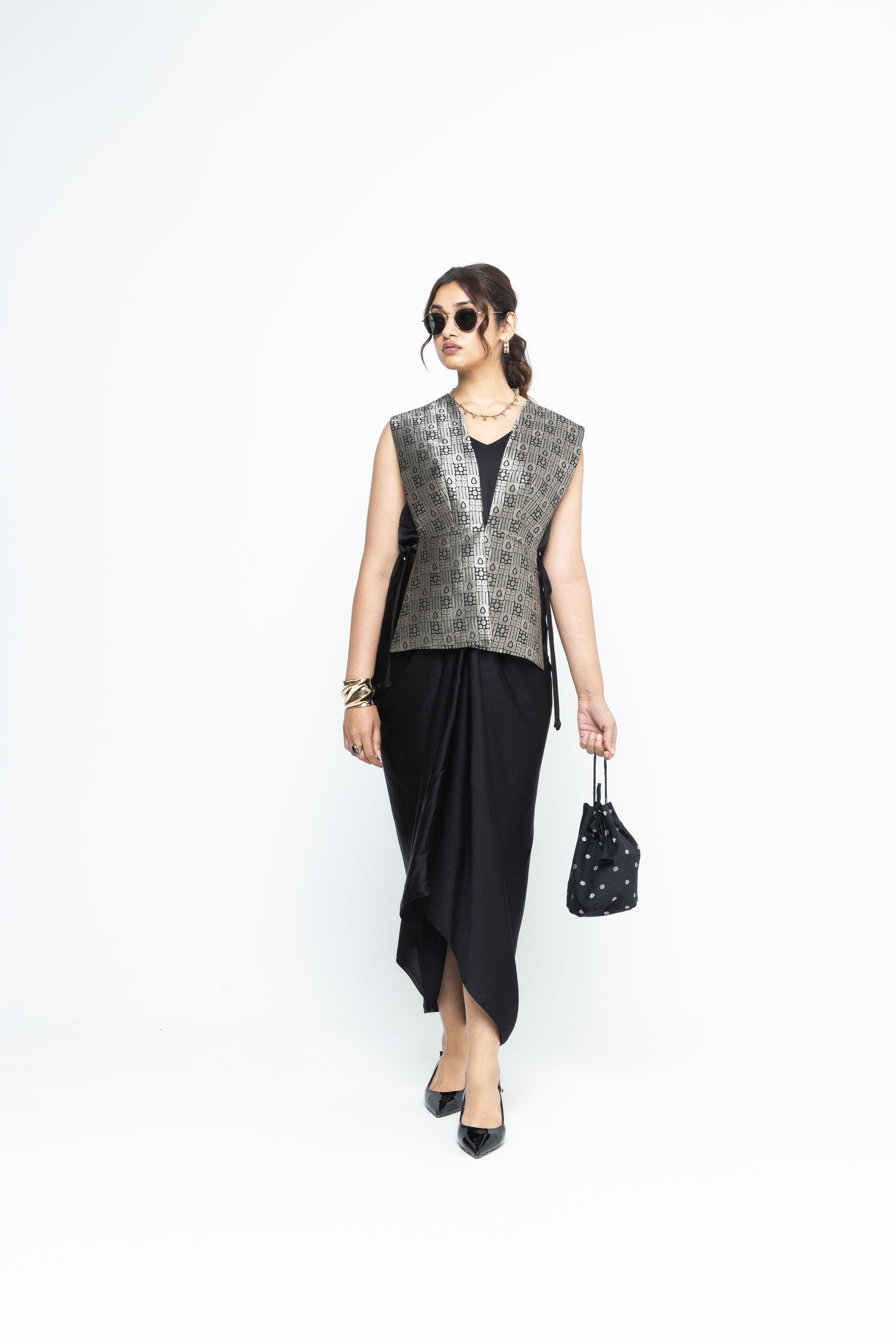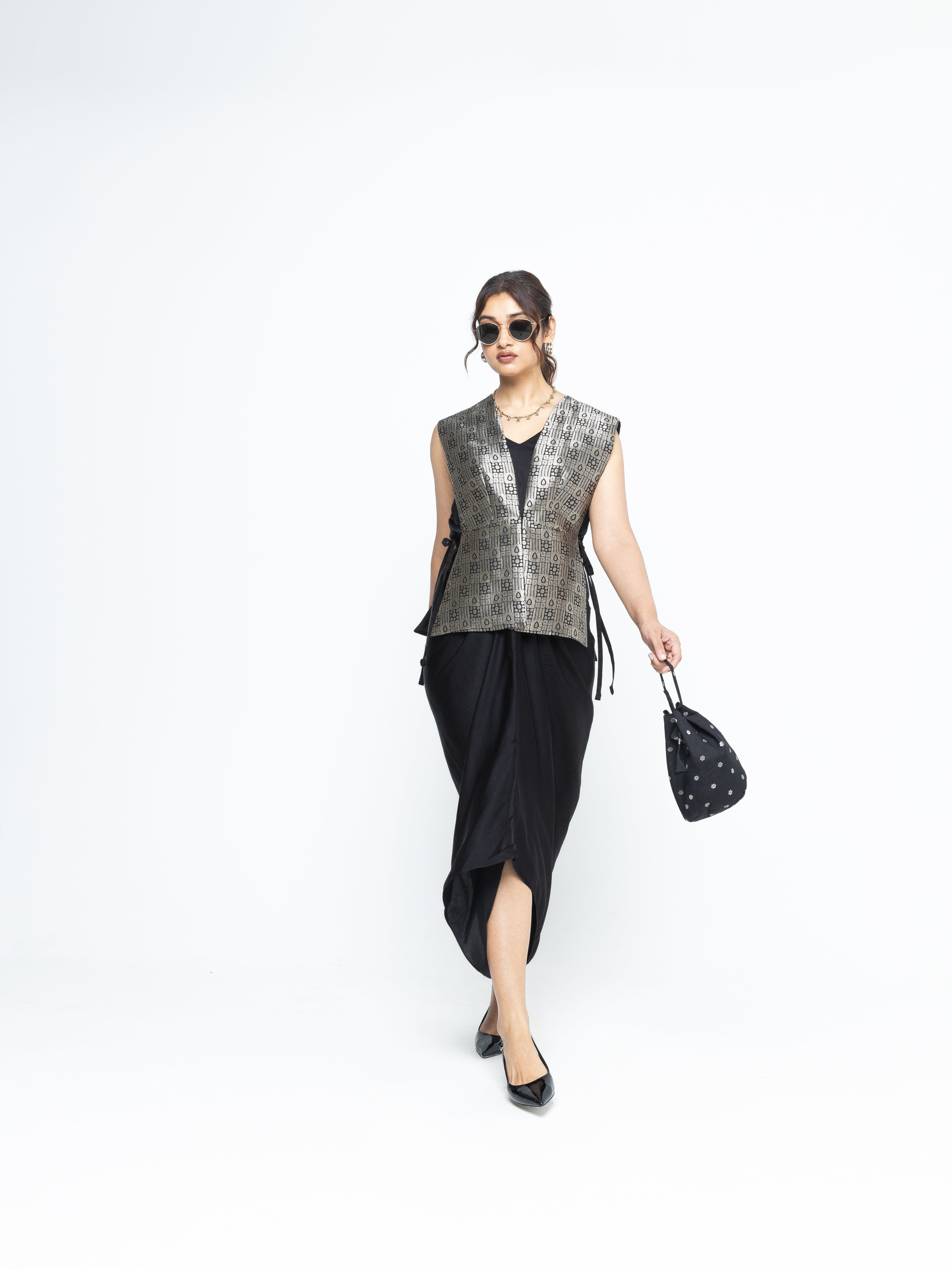 Black Gilet with tie details on the side paired with a matching assymetrical dress