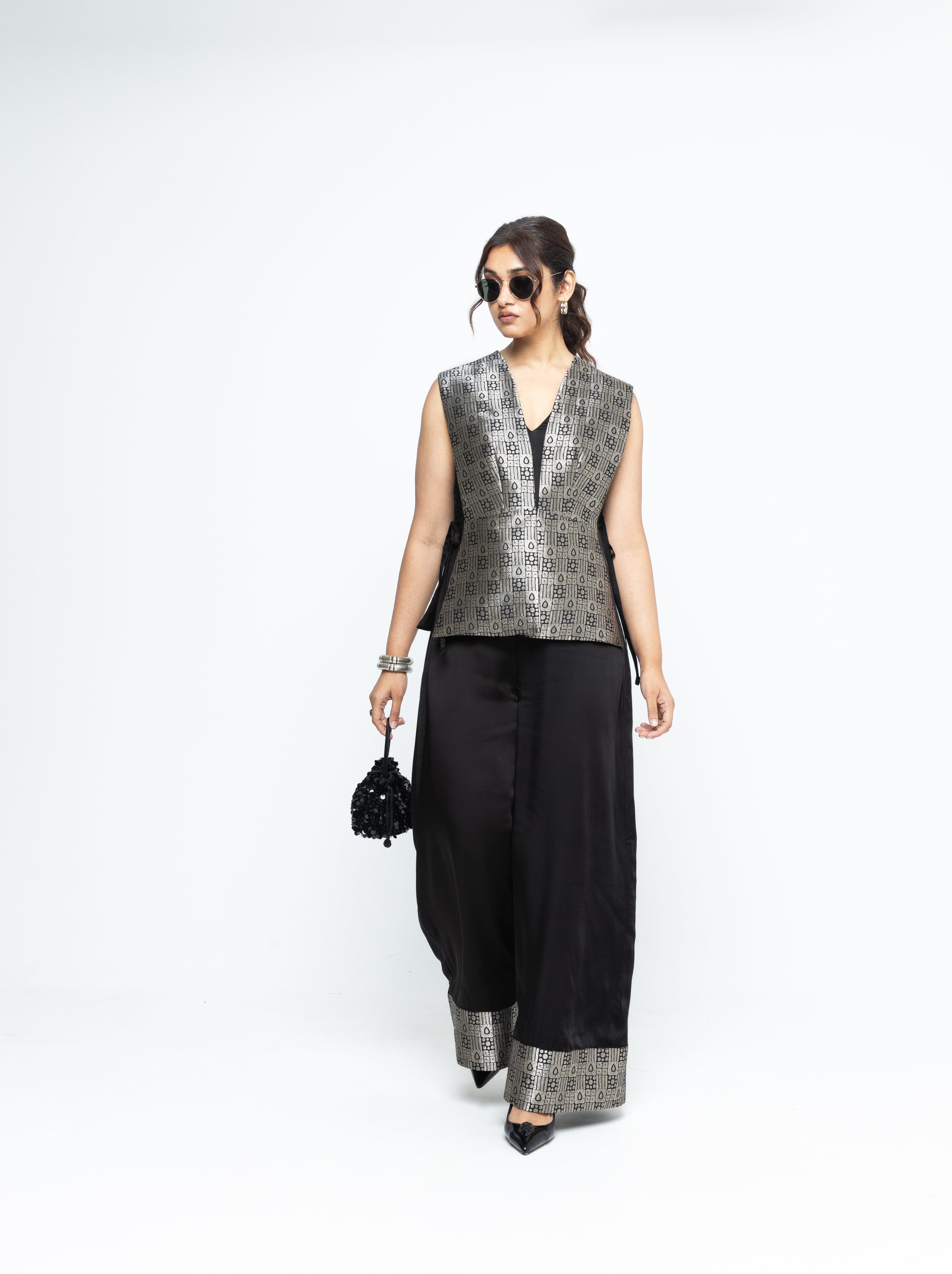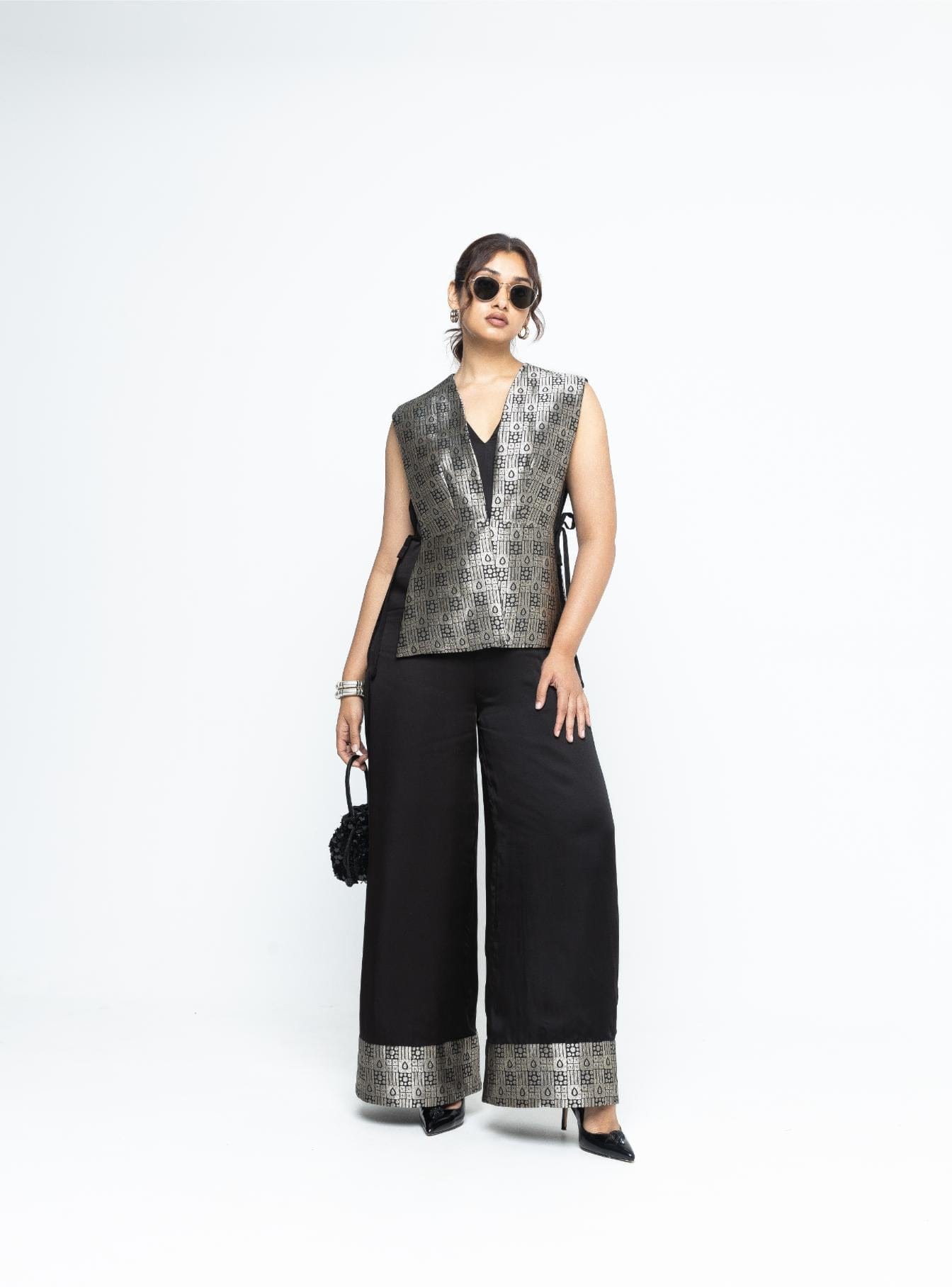 Black Gilet with tie details on the side paired with a matching jumpsuit with brocade details at the hem.