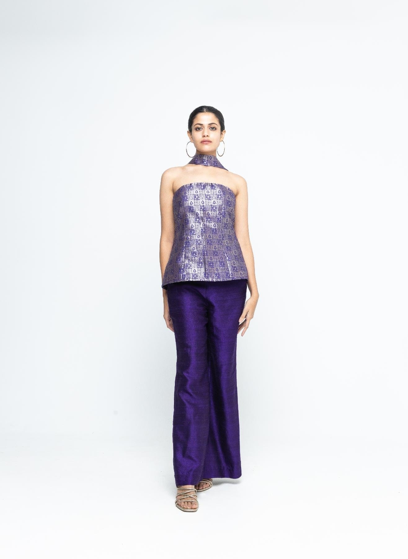 Statement Brocade strapless top paired with raw silk pants to give a sleek look.