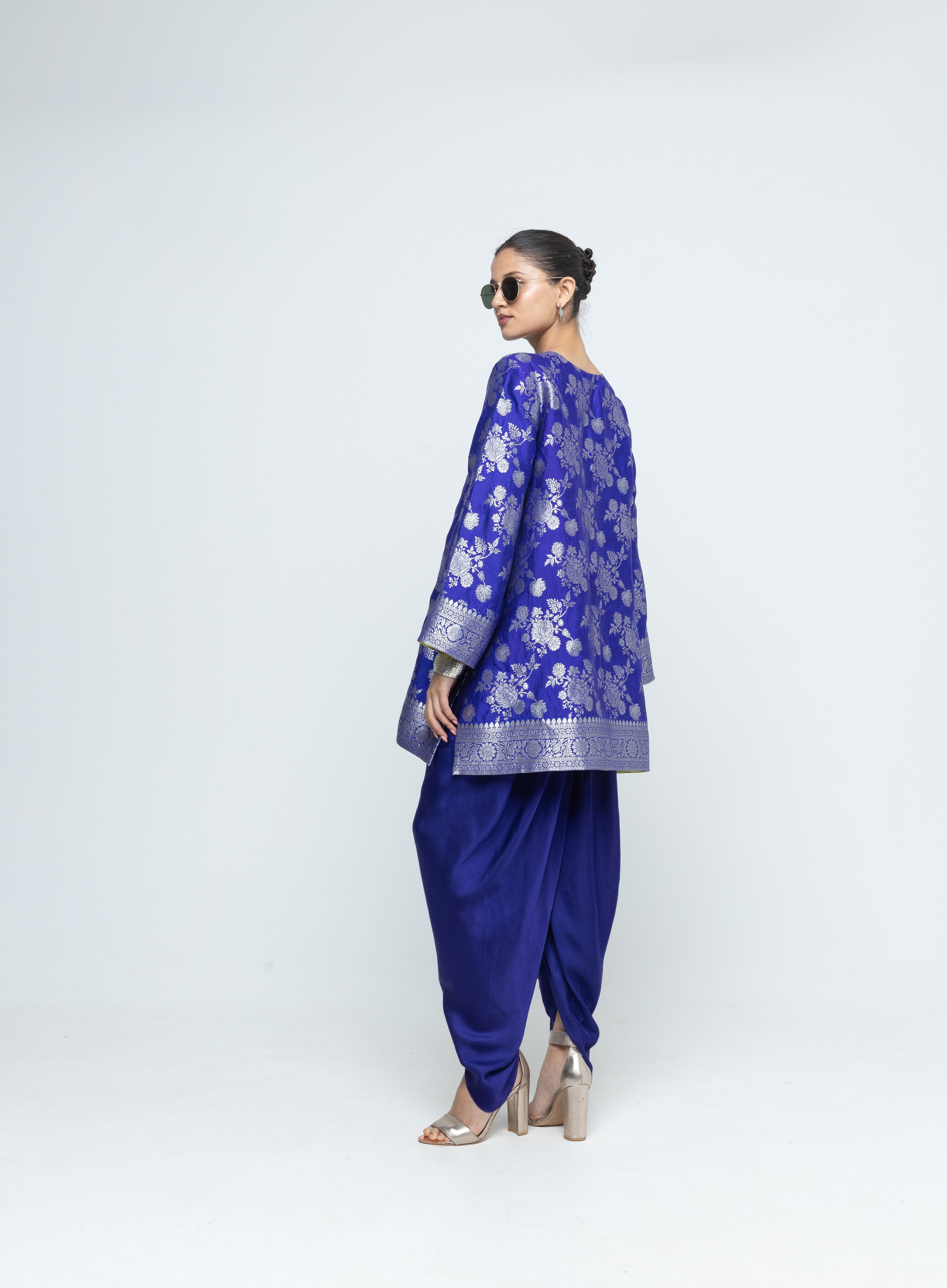 Ultramarine Floral Brocade Jaal Silk Kurta with woven benerasi details paired with a matching Dhoti