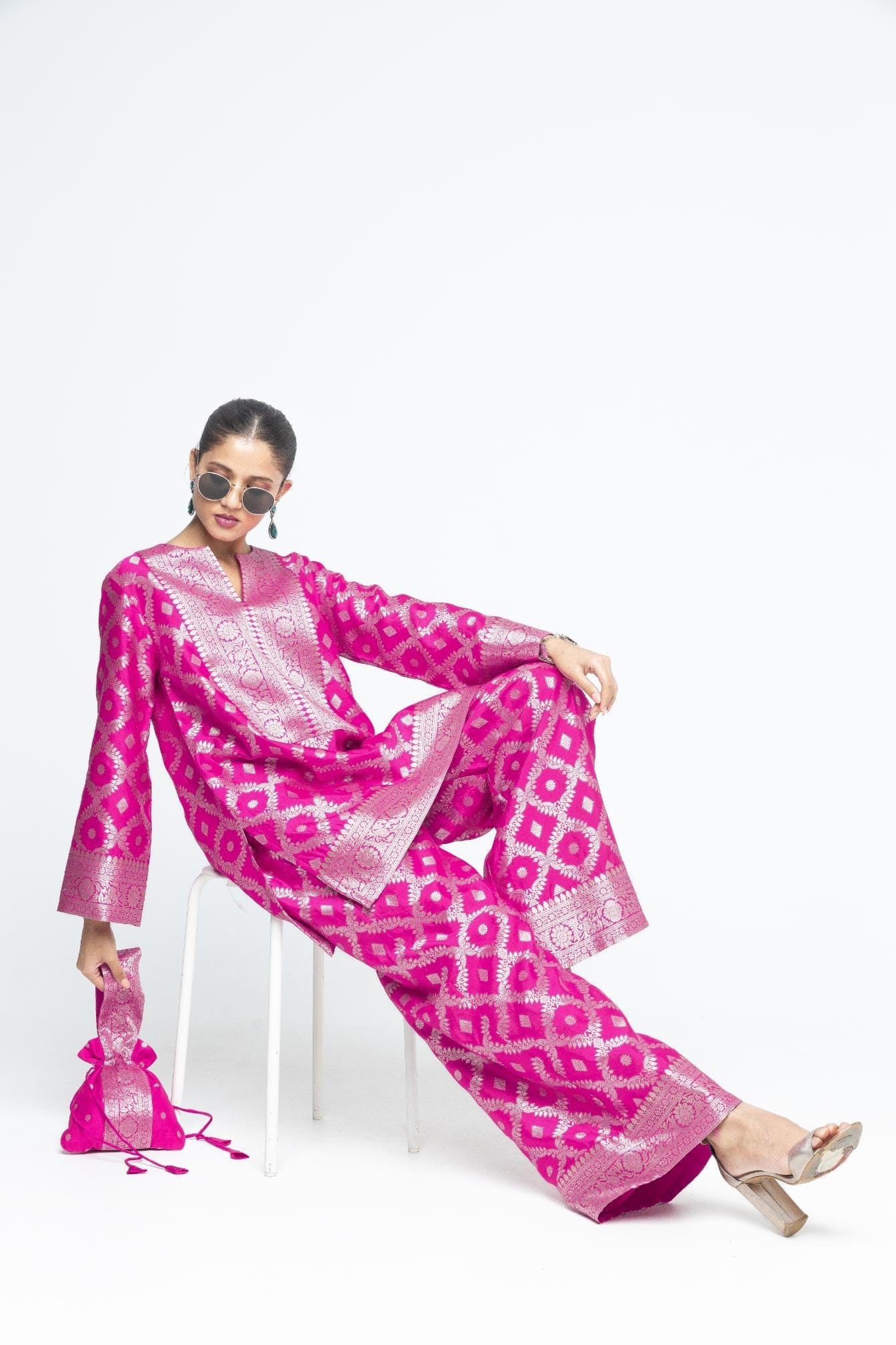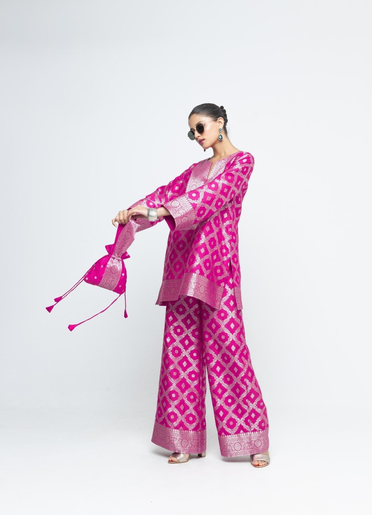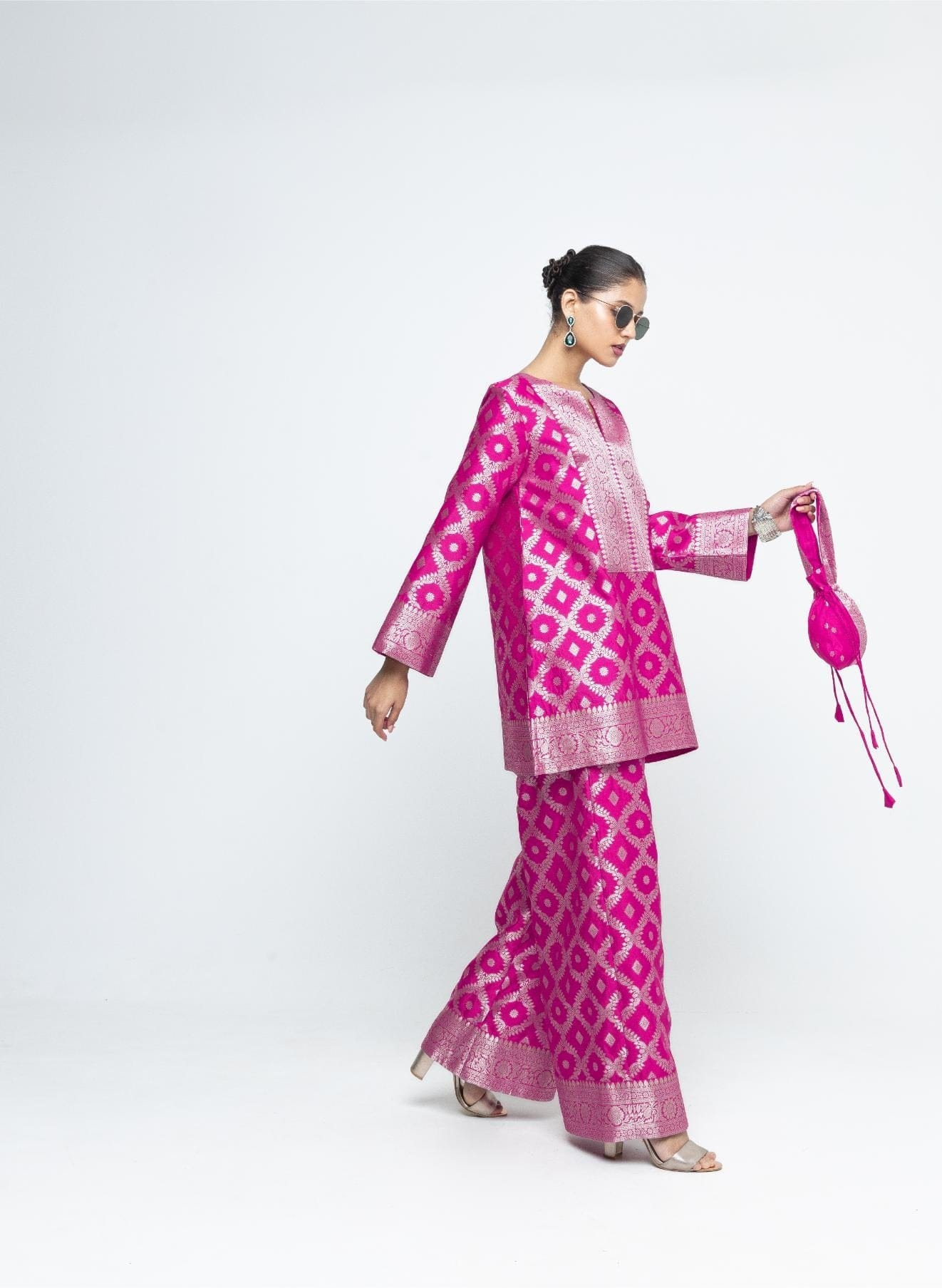 Pink Jaal Silk Kurta with woven brocade details on neck sleeves and bottom paired with matching pants