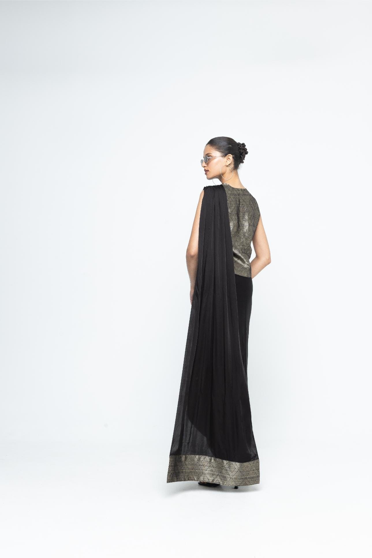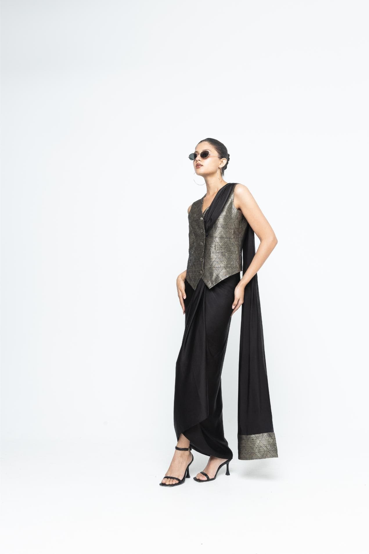 Black Brocade raw silk waiscoat paired with detachable pleated pallu and matching tie detail skirt