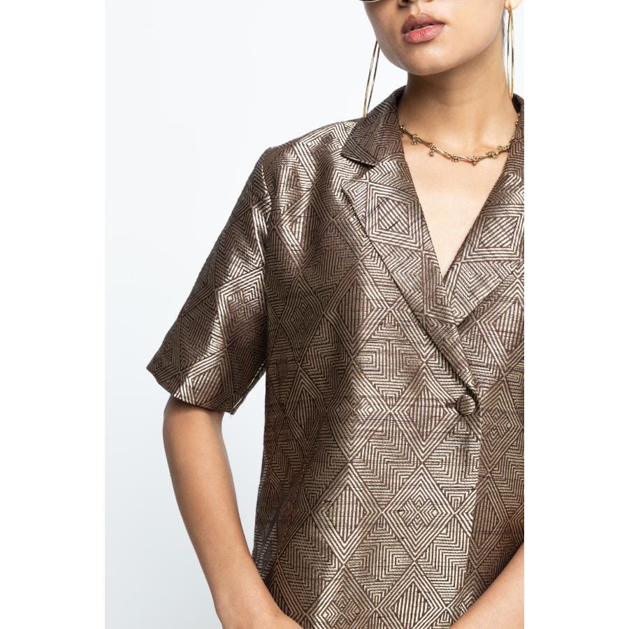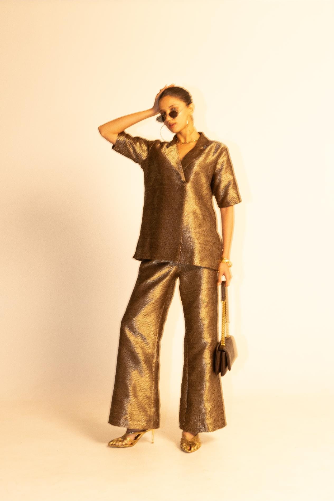 Gold Brown Statement Raw Silk geometric patterned handwoven Wrap detail metallic blazer with matching pants
