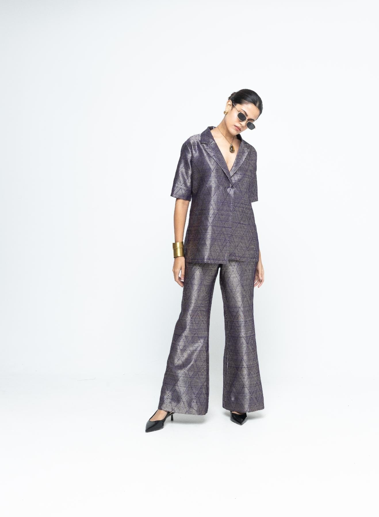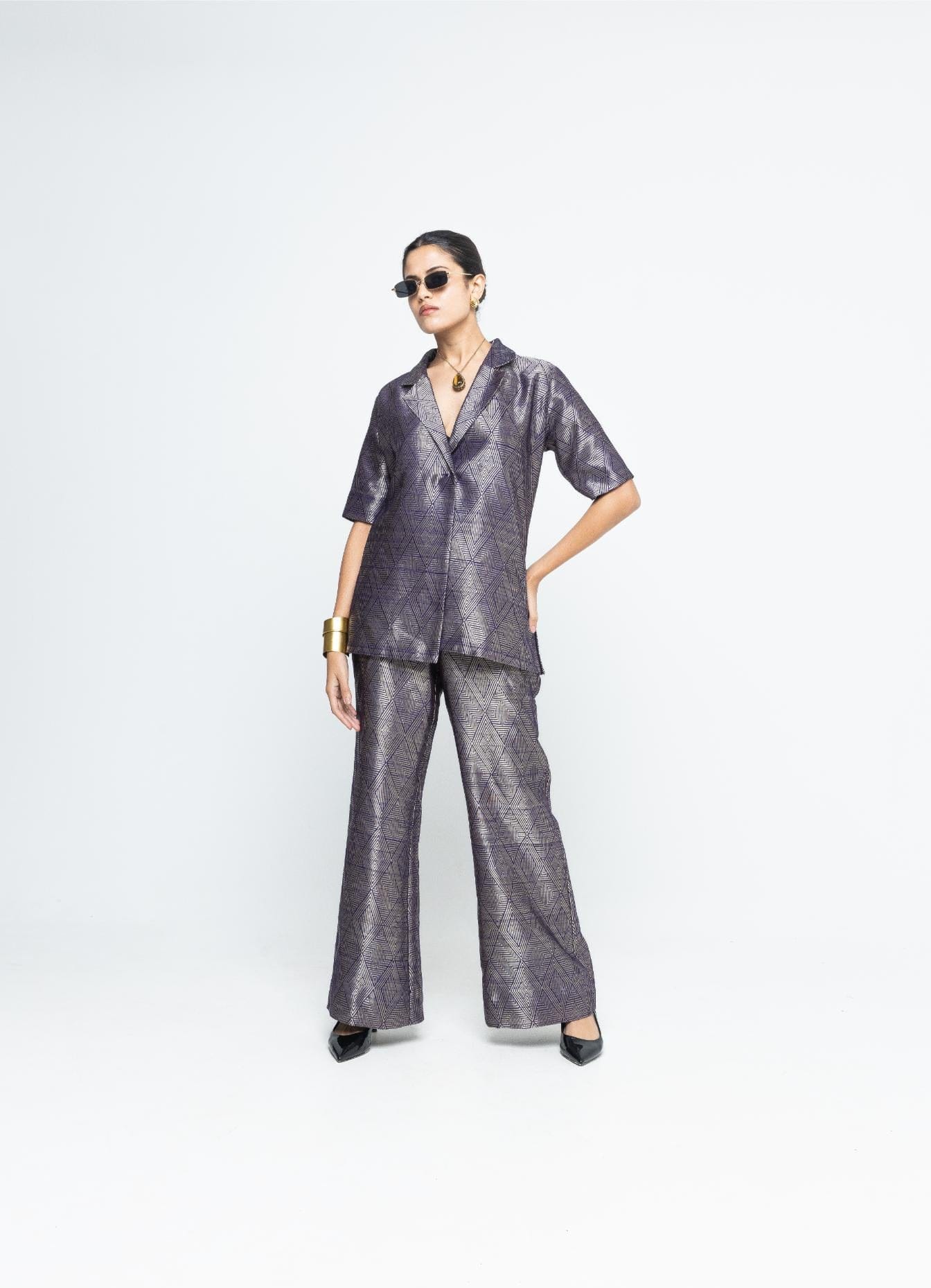 Gold Purple Statement Raw Silk geometric patterned handwoven Wrap detail metallic blazer set