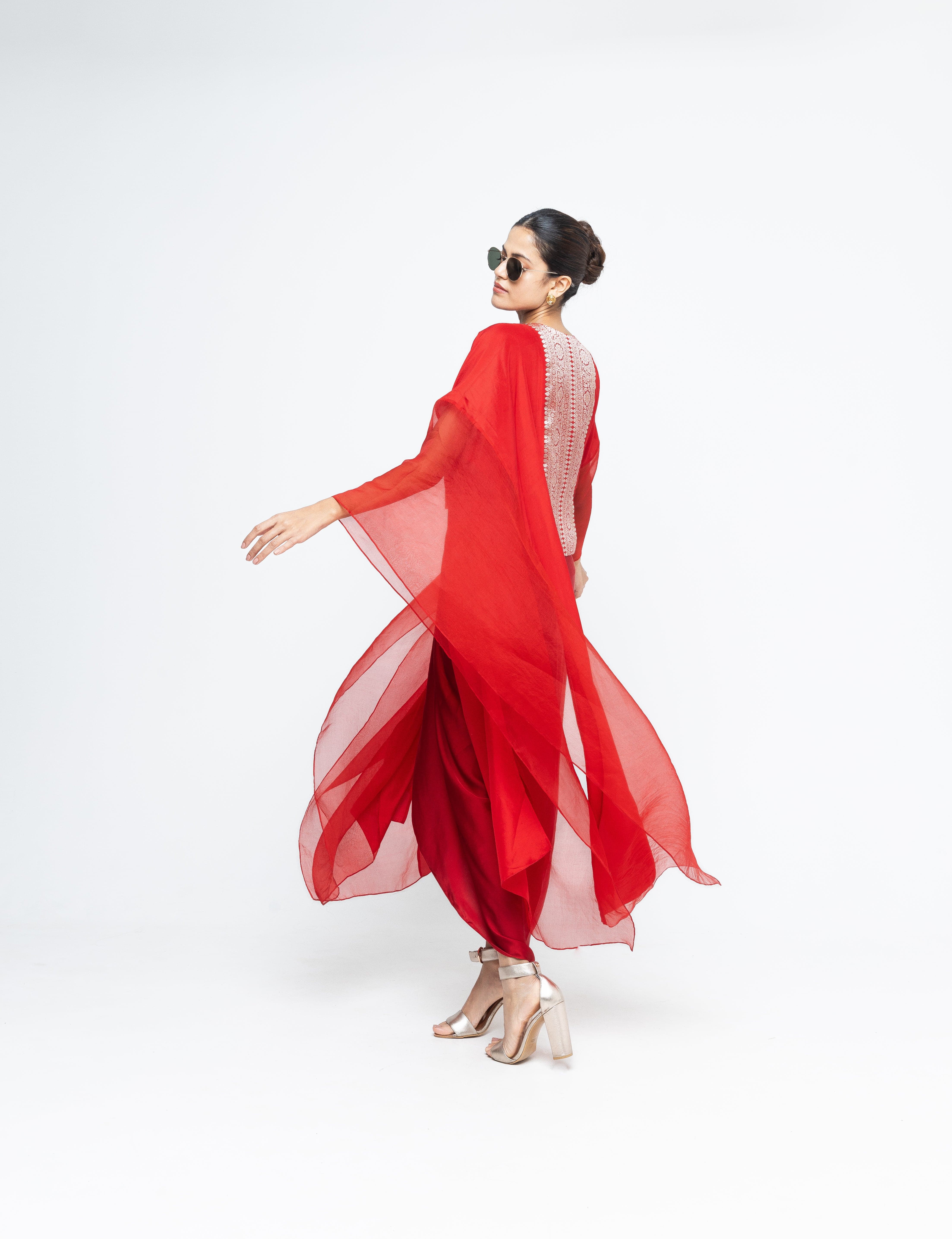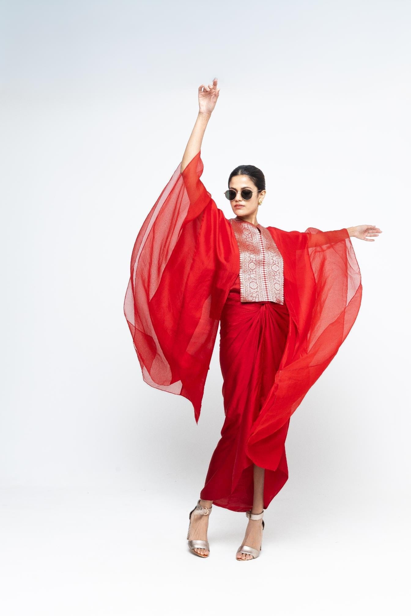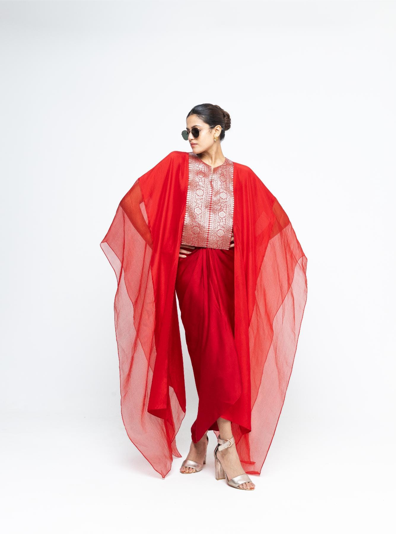 Red Flowy Silk cape with Brocade neck and back detail and organza finish paired with an Assymetrical tie detail dress
