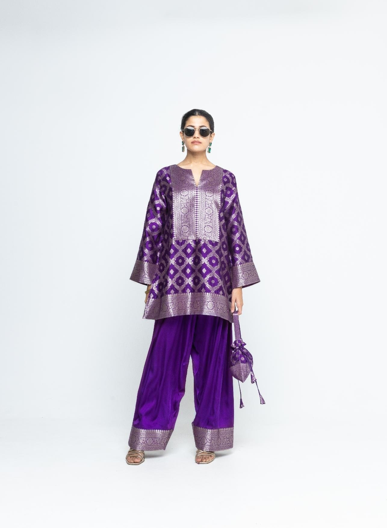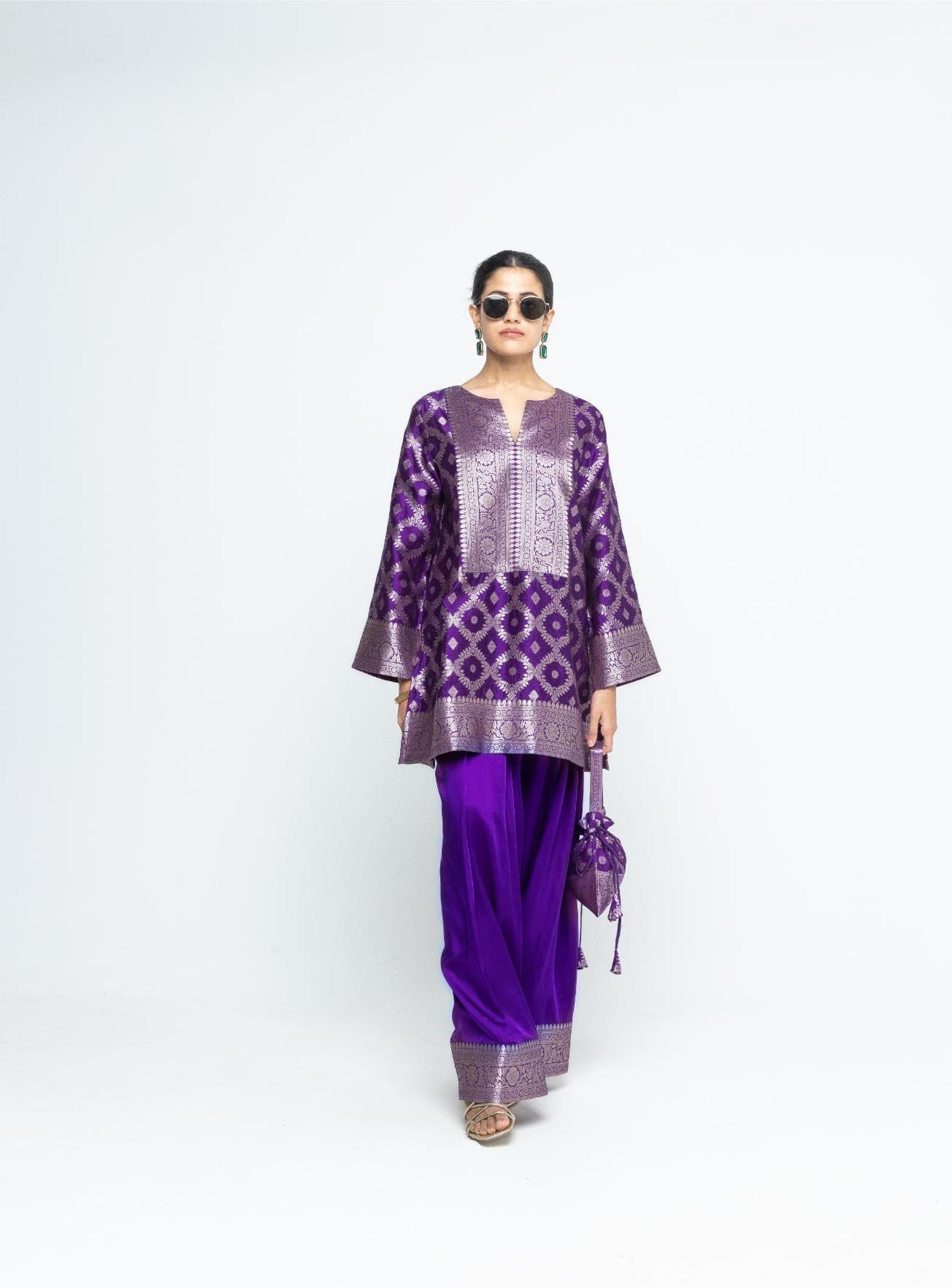 Purple Jaal Silk Kurta with woven brocade details on neck sleeves and bottom paired with matching Farshi salwar with brocade details at the hem.