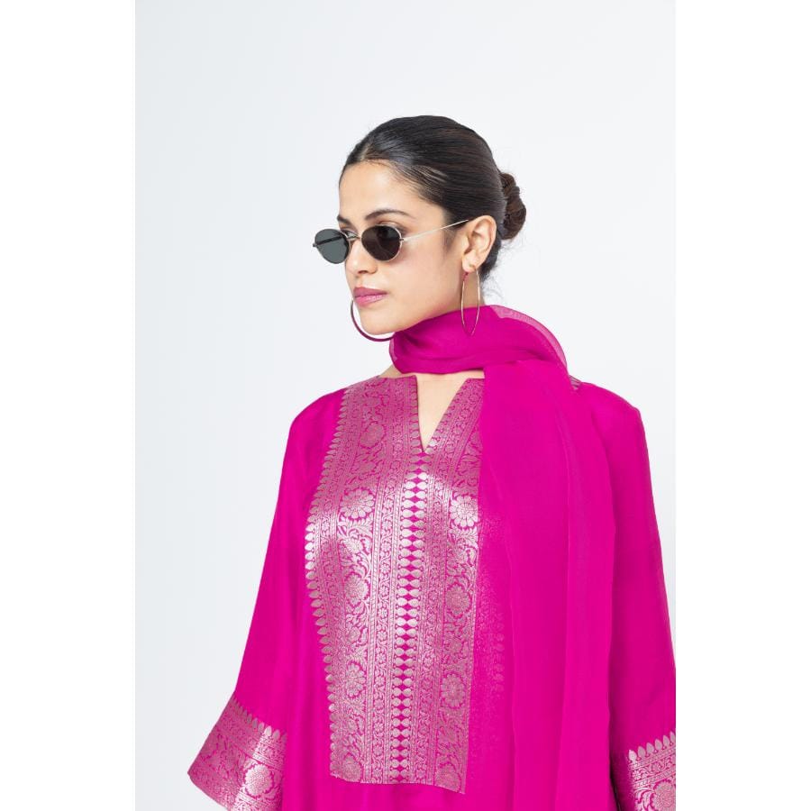 Pink Pure silk Tunic with woven benarasi details at front and back yoke and sleeves with matching pants with brocade detail at the hem paired with organza dupatta with brocade details.