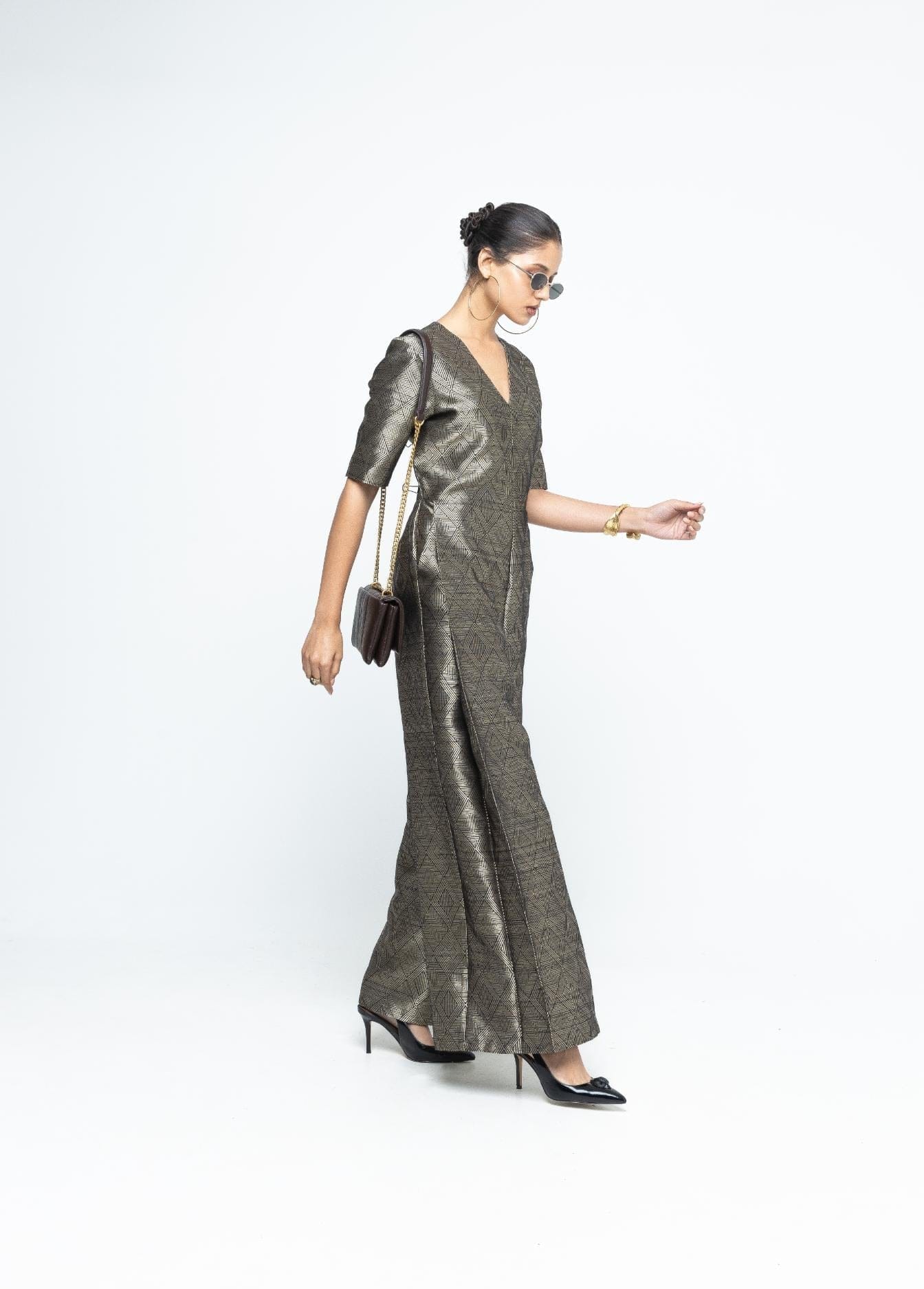 Gold Black statement Raw silk geometric jumpsuit handwoven v neck Jumpsuit with elbow sleeves and pocket detail.