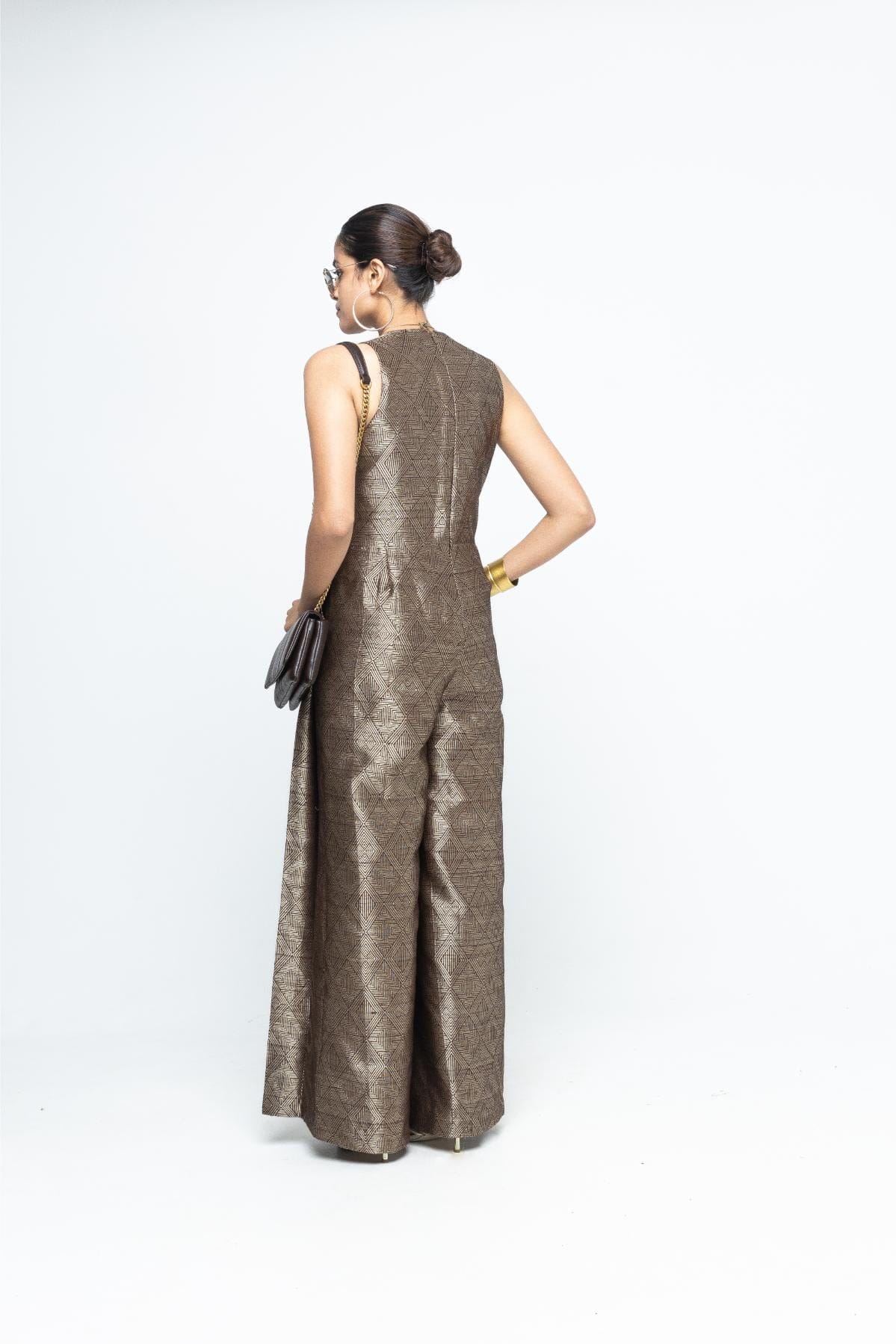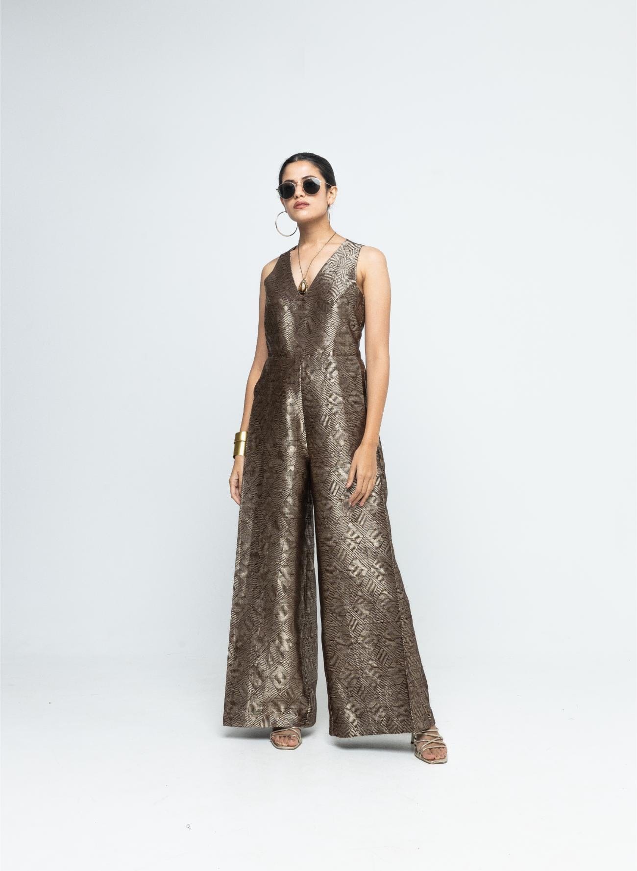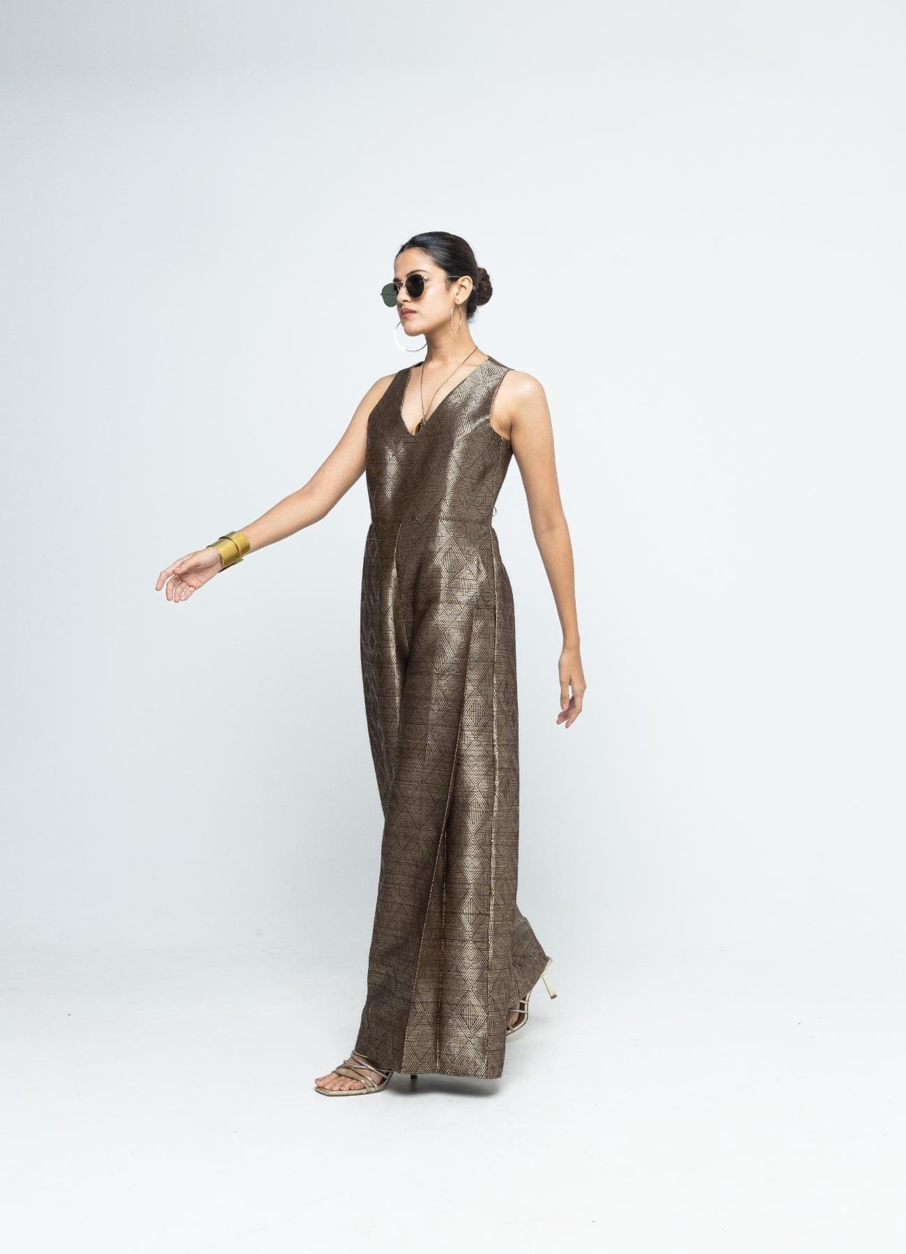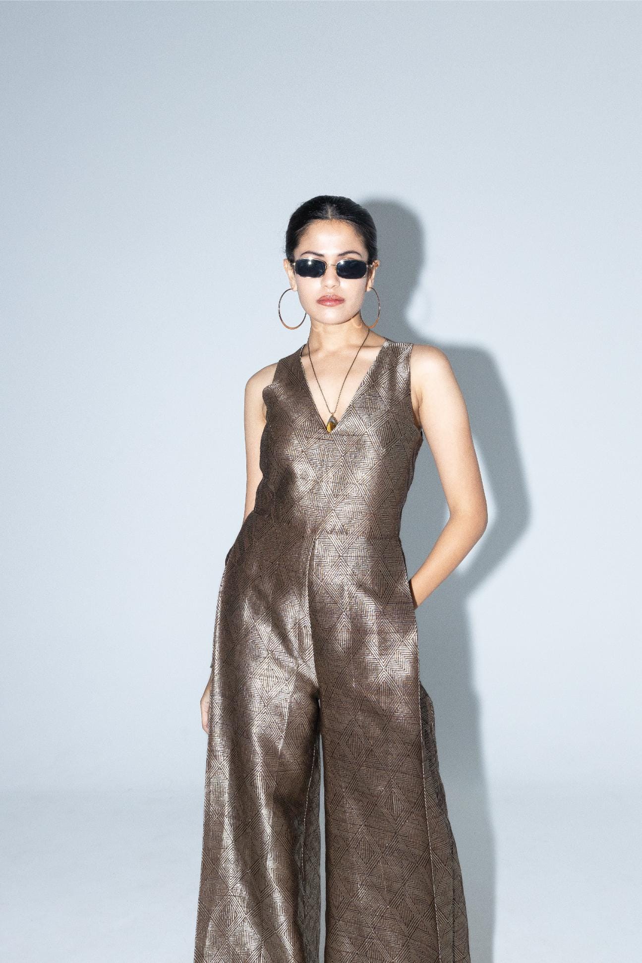 Gold Brown statement Raw silk geometric jumpsuit handwoven v neck Jumpsuit with pocket detail.