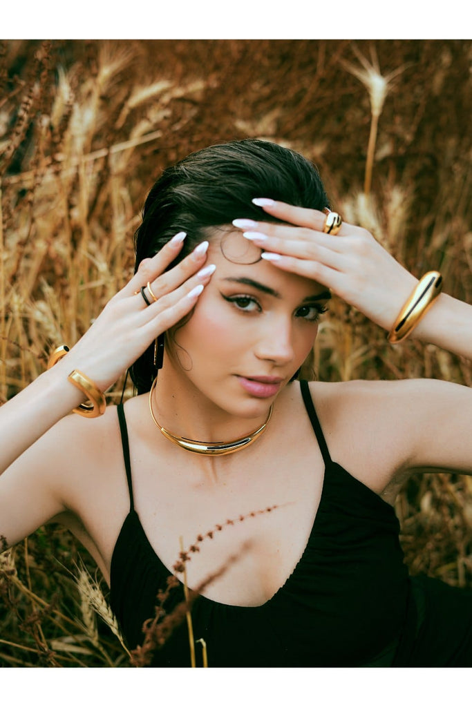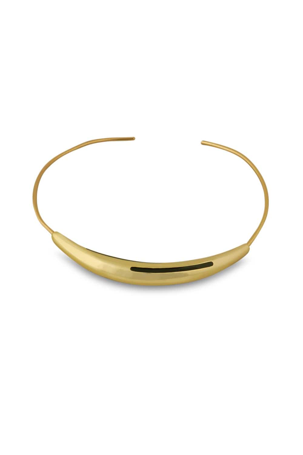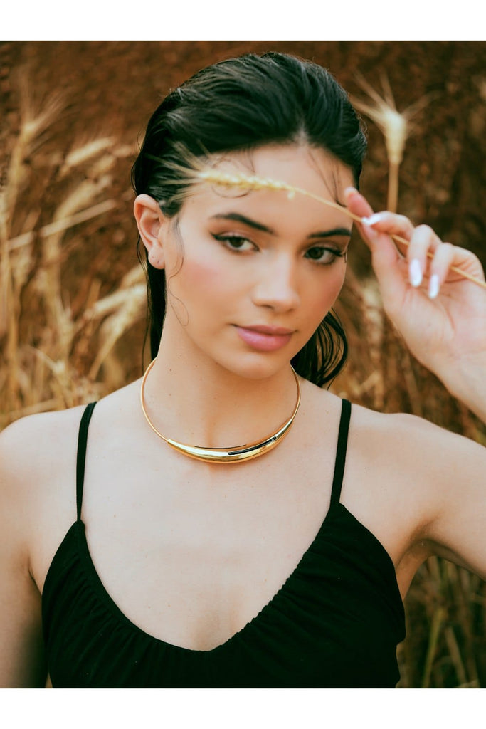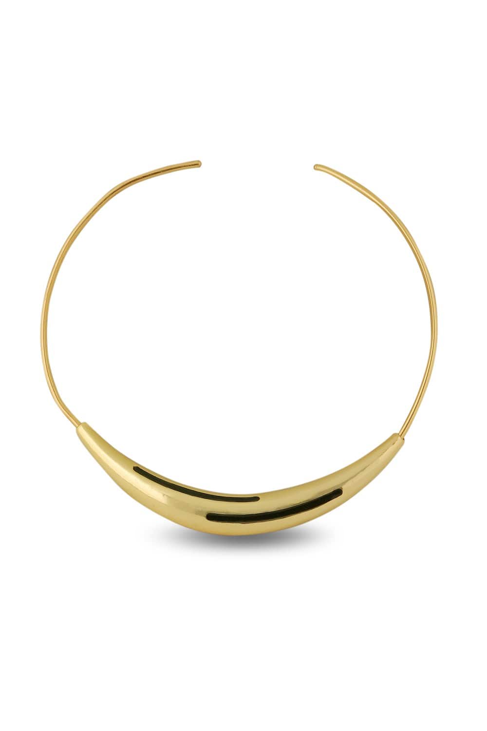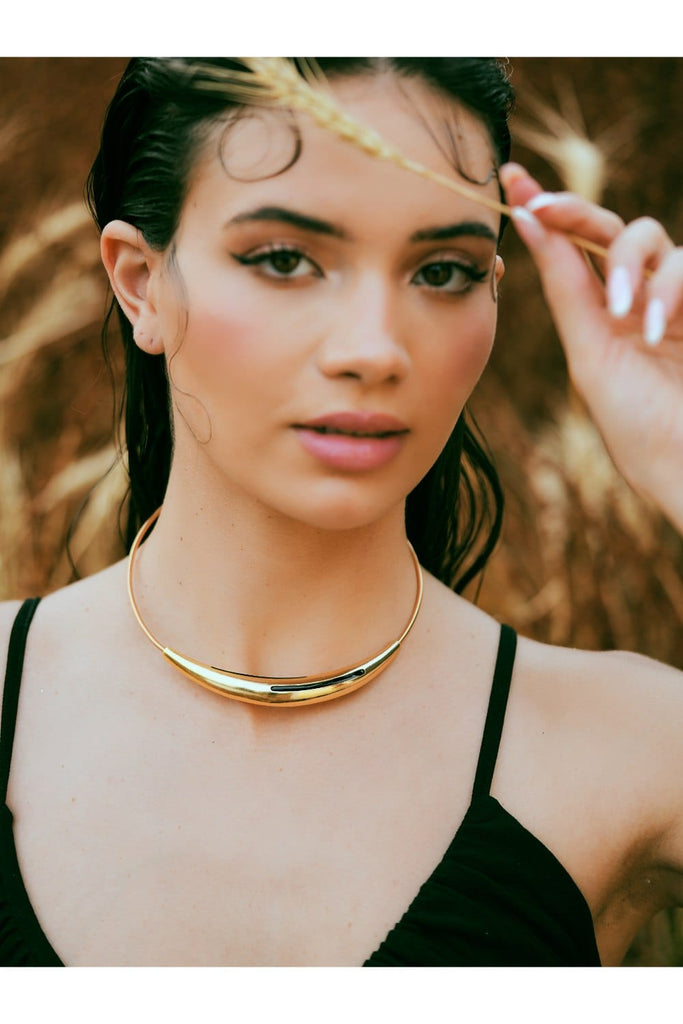 Make a bold yet refined statement with the Aurelia Black Enamel Gold Necklace. This structured collar-style piece features a luminous gold-tone arc, beautifully accented with sleek black enamel inlays. Its minimalist design is elevated by clean lines and a sculptural silhouette that sits gracefully at the collarbone, offering a touch of modern edge to any ensemble.