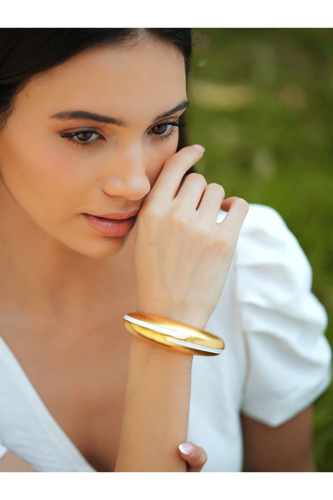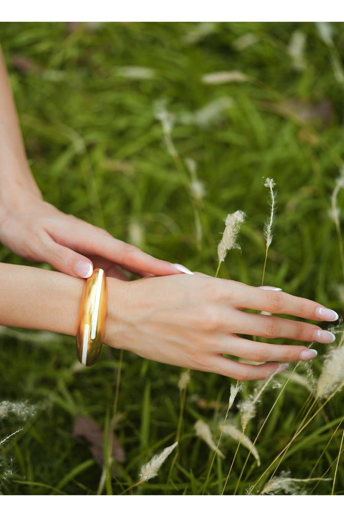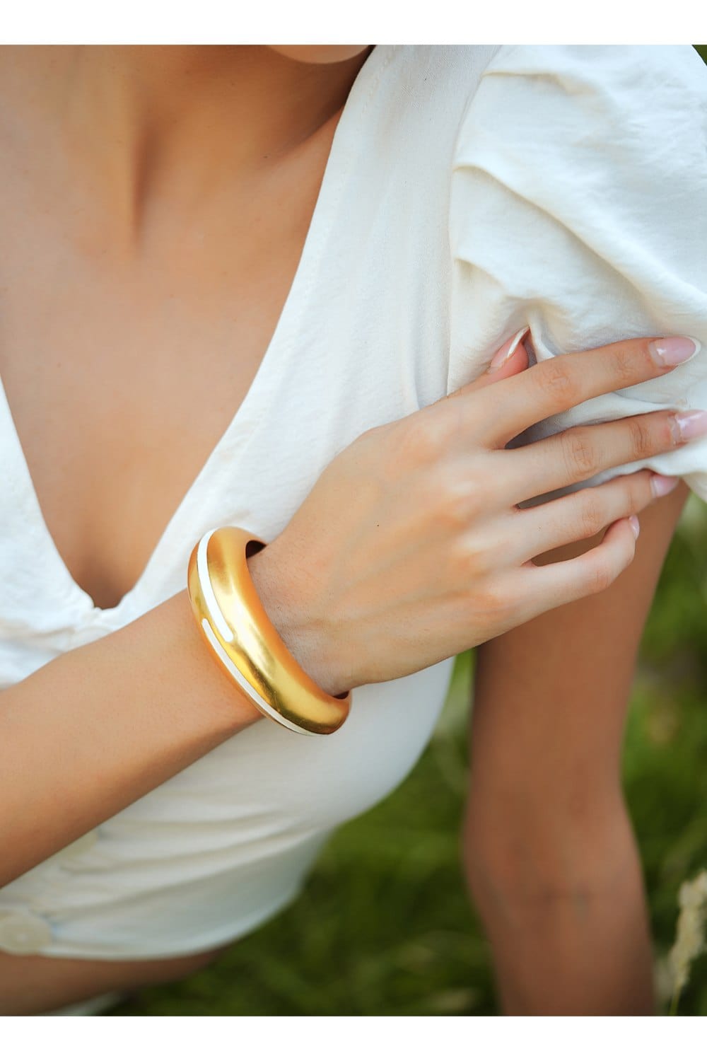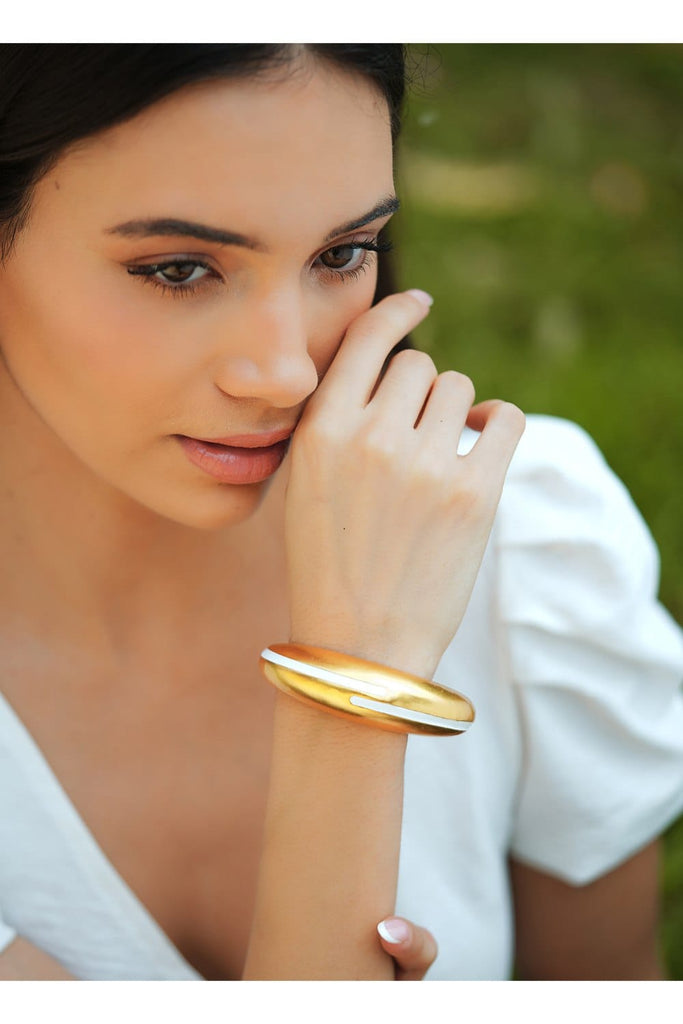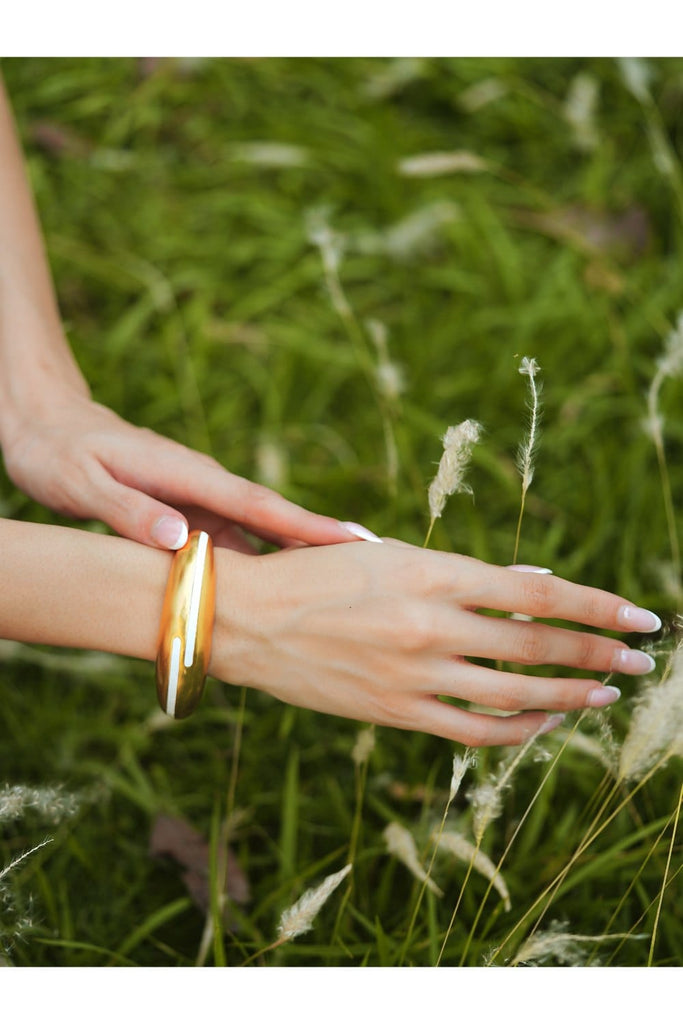 Elevate your accessory game with the Circlet White Enamel Gold Bangle, a bold yet elegant statement piece designed for modern sophistication. Crafted with a sleek, polished gold finish and accented with a subtle white enamel inlay, this bangle exudes contemporary charm and artistic flair. Its sculptural form hugs the wrist comfortably, making it perfect for both everyday wear and special occasions.