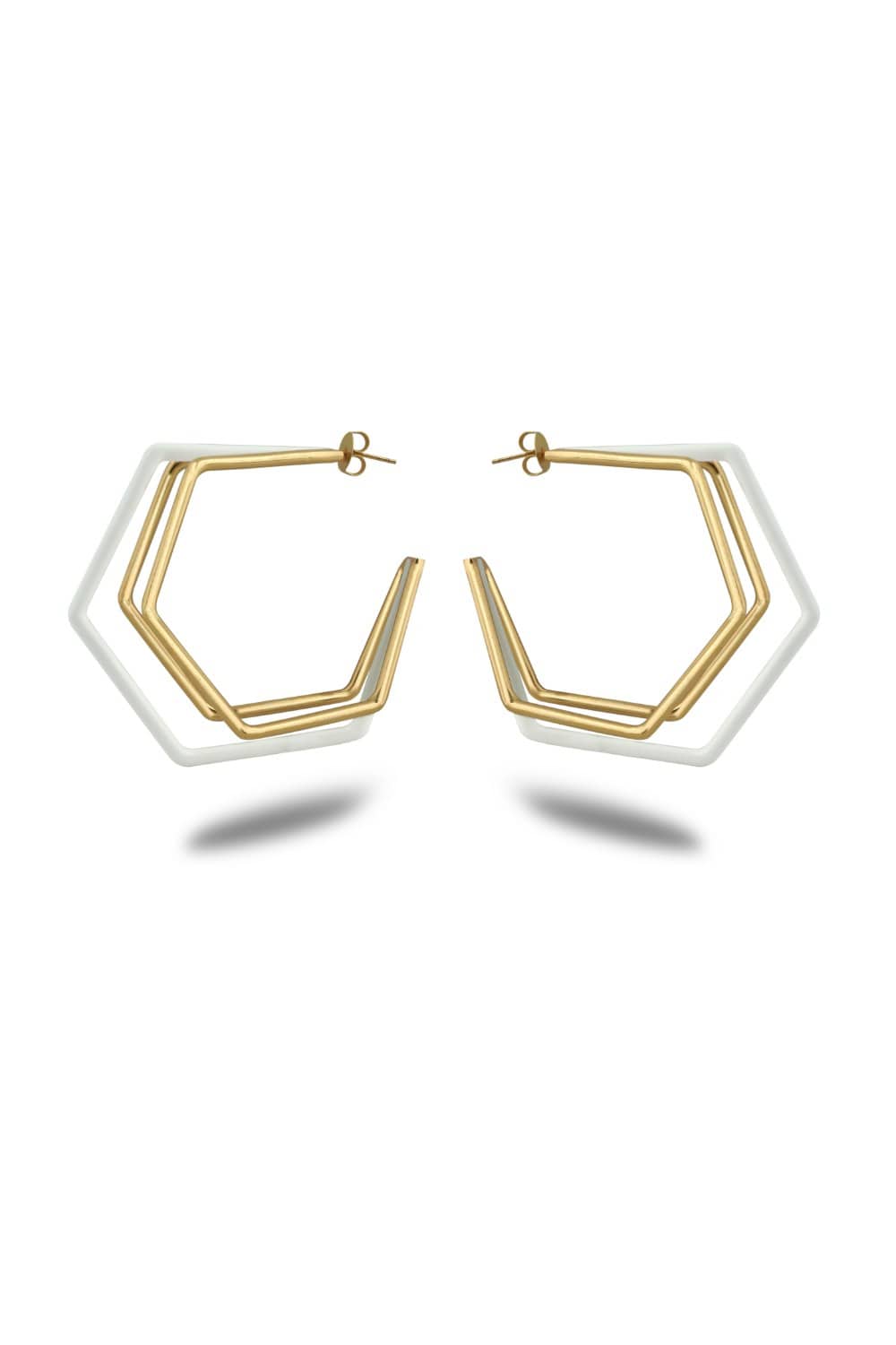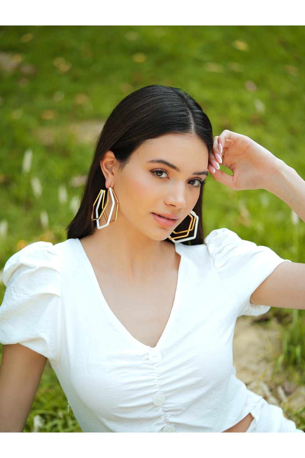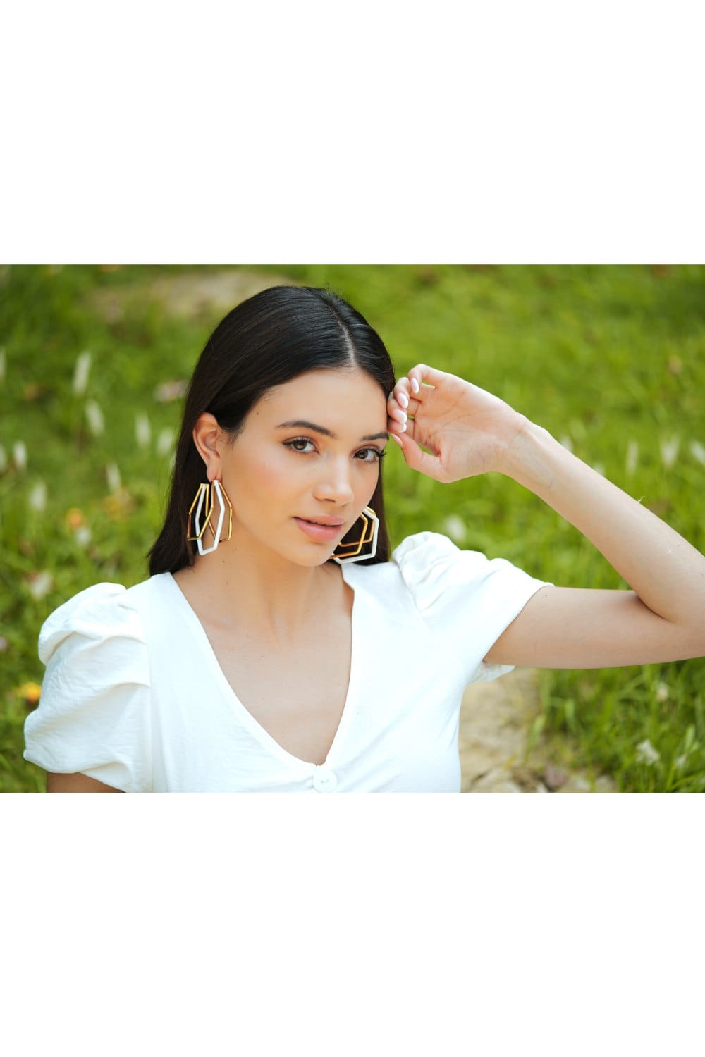 Elevate your style with these striking geometric hoop earrings, where modern elegance meets bold design. Featuring interlocking hexagonal shapes in rich gold and white, these earrings make a statement with their unique structure and vibrant contrast. Perfect for both daytime charm and evening sophistication, they add a touch of contemporary luxury to any look. Lightweight yet eye-catching, they’re the ultimate accessory for the fashion-forward woman.