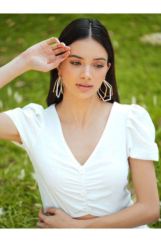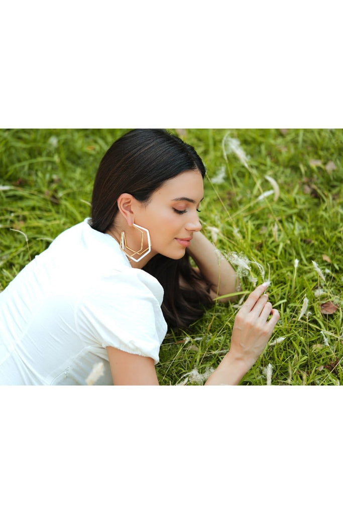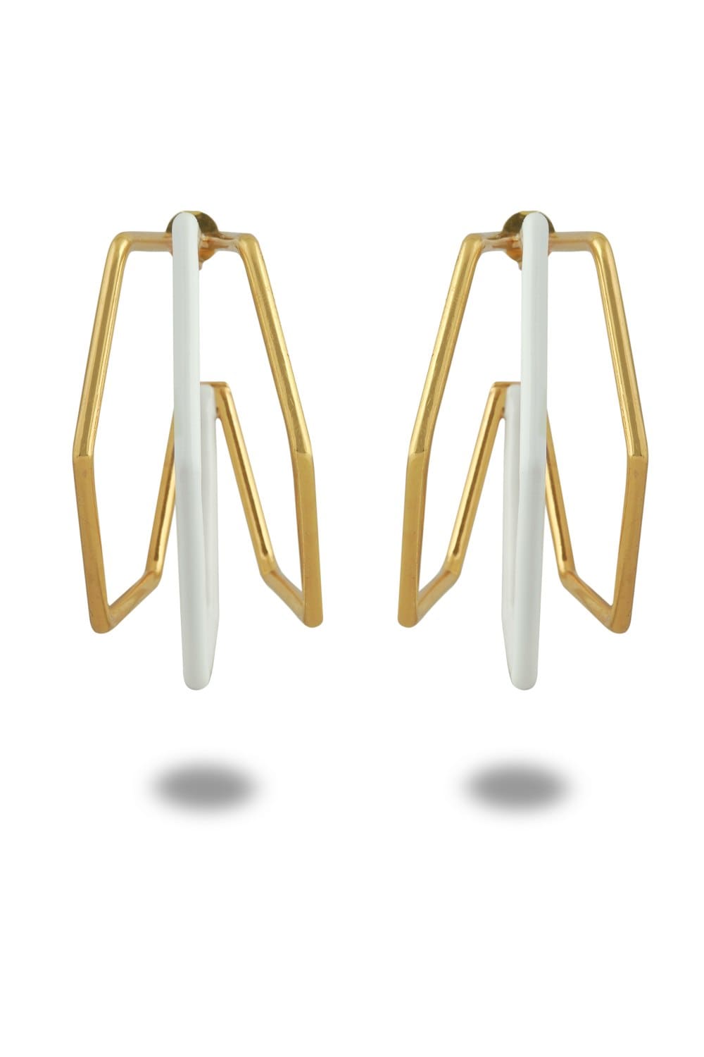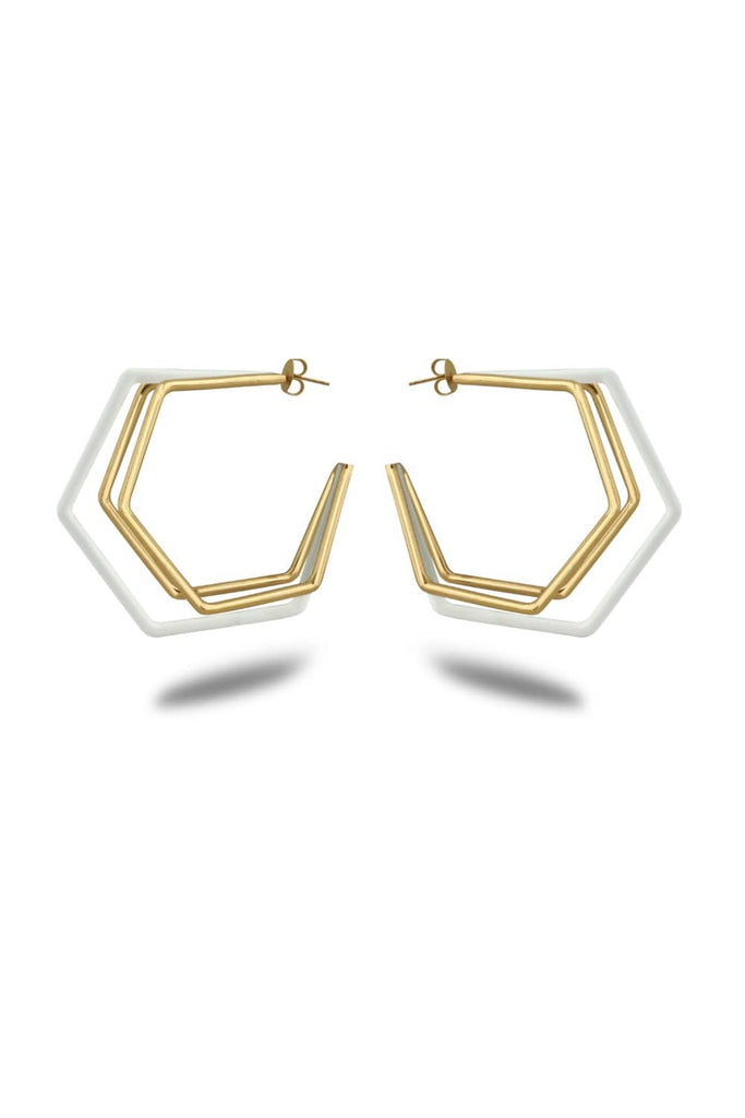Elevate your style with these striking geometric hoop earrings, where modern elegance meets bold design. Featuring interlocking hexagonal shapes in rich gold and white, these earrings make a statement with their unique structure and vibrant contrast. Perfect for both daytime charm and evening sophistication, they add a touch of contemporary luxury to any look. Lightweight yet eye-catching, they’re the ultimate accessory for the fashion-forward woman.