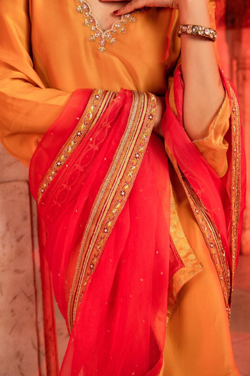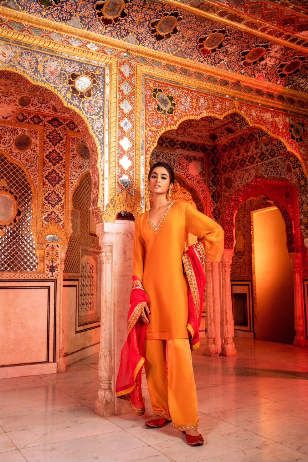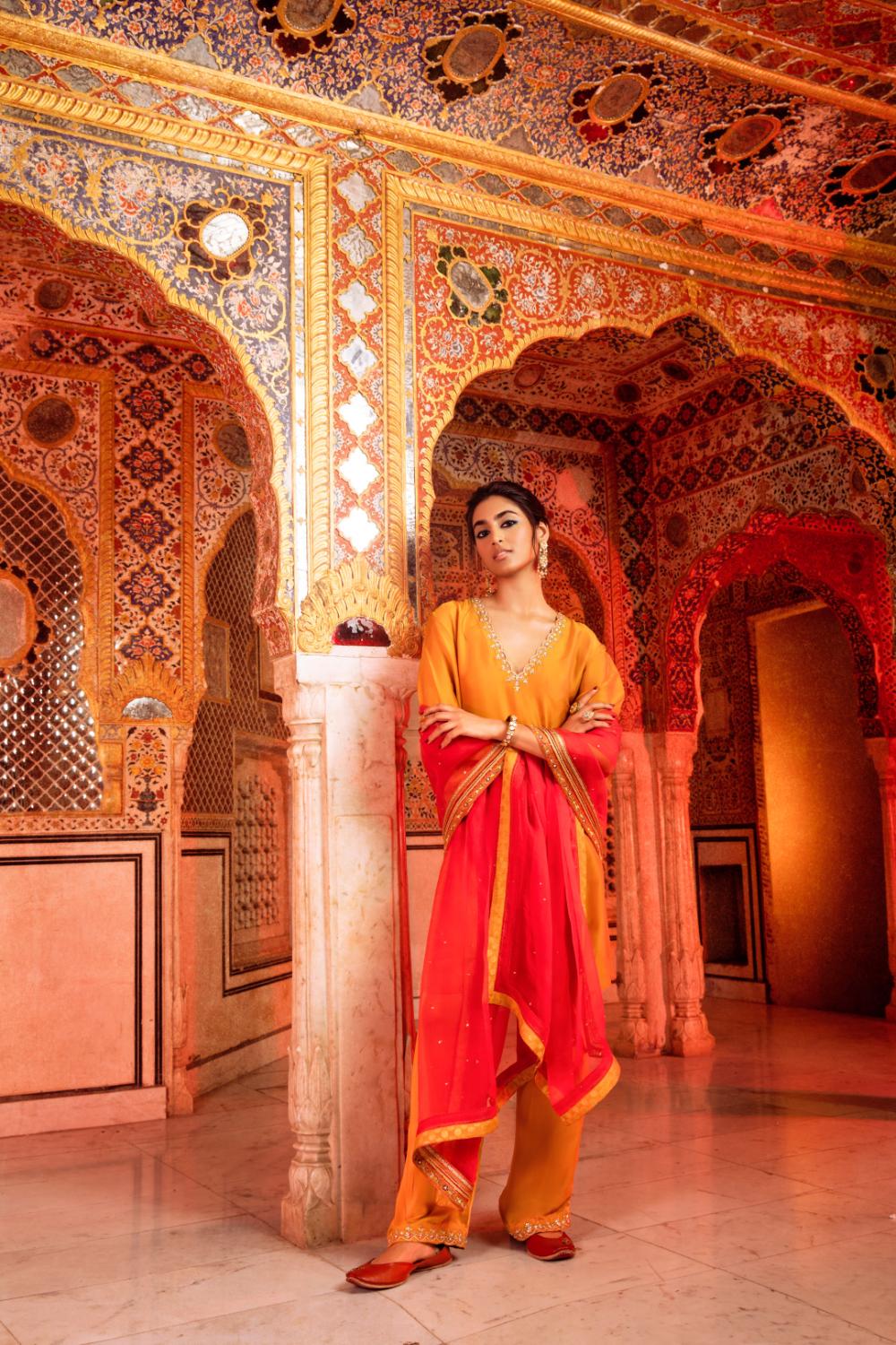 A radiant kurta set that celebrates simplicity with quiet elegance. The straight-cut kurta features a softly contoured neckline and a relaxed silhouette, paired with fluid wide-leg pants for effortless movement. A contrasting dupatta, edged with subtle detailing, adds depth and balance to the ensemble.